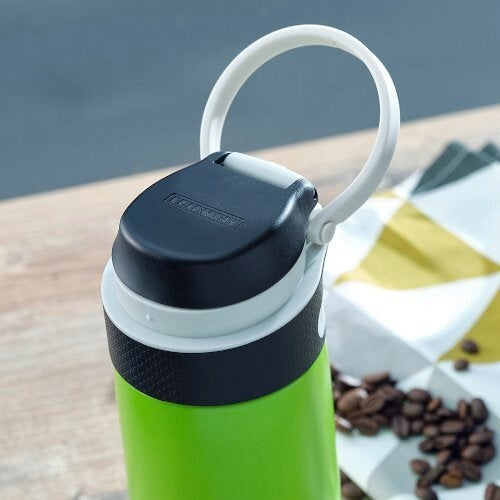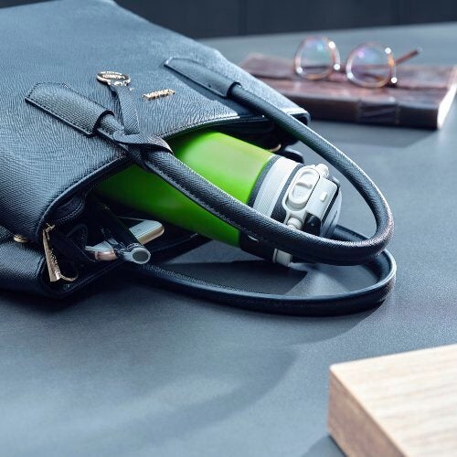 Un accessoire pratique pour tous ceux qui ne peuvent pas se passer de café ou de thé même en déplacement : le mug isotherme 350 ml de Leifheit. Il est 100 % étanche et donc garanti anti-fuite. Il présente également une ouverture facile à une main sans avoir à le poser. Le bouton poussoir pour ouvrir le couvercle est facile à actionner avec l’index. Un verrouillage supplémentaire du couvercle prévient les ouvertures accidentelles : on peut donc le transporter sans problème dans un sac. Le mug est également doté d’une surface anti-dérapante pour une meilleure tenue et une ouverture particulièrement facile. La poignée rabattable permet non seulement une tenue pratique du mug isotherme Flip 350 ml, mais aussi de le fixer à un sac à dos ou un sac à main. Le filtre amovible permet l'obtention d'une boisson sans résidu. La double-paroi en acier inoxydable du mug isotherme Flip maintient les boissons jusqu’à six heures au chaud et jusqu’à 18 heures au frais. De par sa taille compacte et sa contenance de 350 ml, il est parfaitement adapté pour une utilisation quotidienne et passe sans problème dans la plupart des machines à café. Bien évidemment, ce mug ne contient ni BPA ni aucune autre substance nocive et ne présente donc aucun danger pour la santé. Avec son design en inox allié au kiwi tendance, le gobelet isotherme ne passera pas inaperçu. Il est également disponible en noir, argent, bleu foncé, rouge, violet et bleu clair.- Manipulation pratique à une main pour une ouverture facile et agréable sans devoir poser le mug.